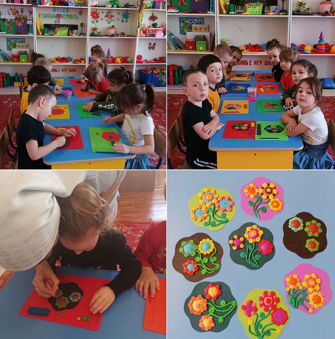 Лепка «Поляна цветов» Цель: продолжать формировать знания детей о цветах, формировать умение передавать образ и форму цветка при помощи пластилина, учить передавать особенности внешнего вида цветов в лепке.